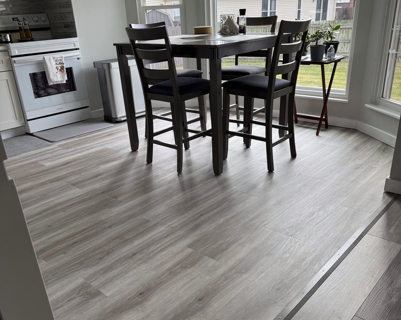 A grey oak style flooring was chosen by one of our clients and we paired it with the previous flooring that runs through the kitchen into the living room. We followed the direction of the previous floors and now the complete look gives the kitchen a nice modern touch with a very clean look. Not too much but just enough-gives it the illusion of a bigger kitchen too. Very good choice of our team to help our client get the closest match.